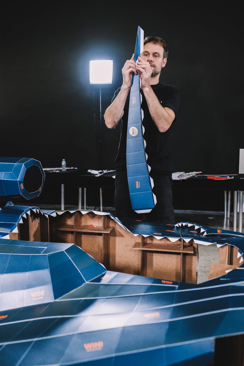 This approach began with 1:8 wall-mounted car sculptures, split along the centre line and hanging on the wall like three-dimensional drawings. Today, it extends into full-scale installations and large art projects, where paper is engineered into bodies, fragments and flows that occupy real space – light in weight, but built with the precision and attitude of motorsport.