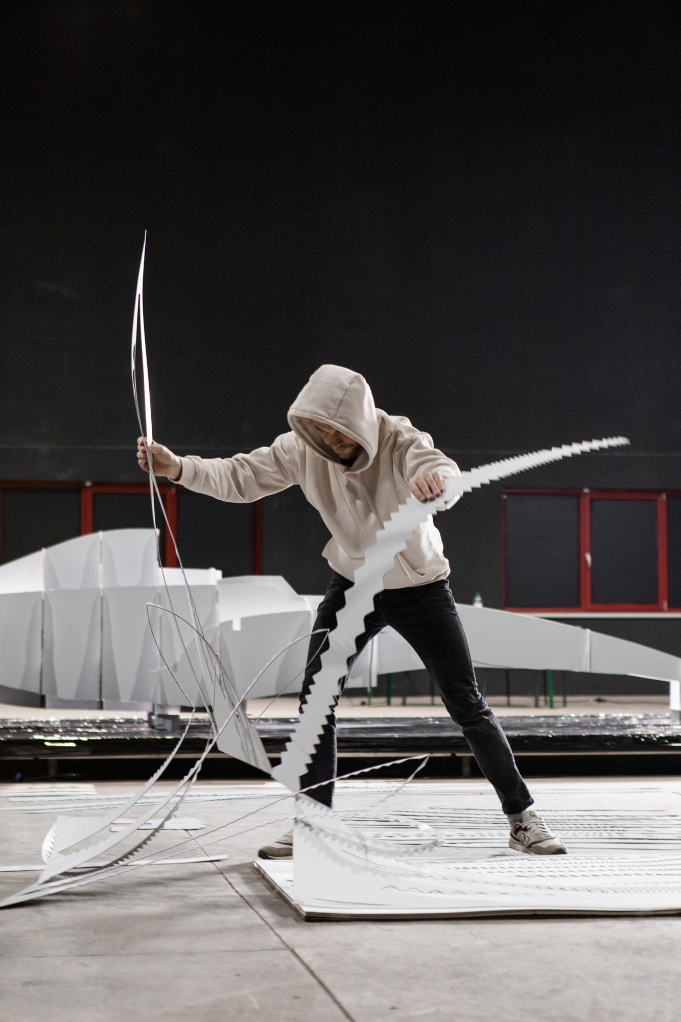 Car volumes are cut into repeating paper slices that highlight the lightness and line of each part. Instead of classic cross-sections, the sculptures reveal the full form through rhythm, repetition and finely layered contours.